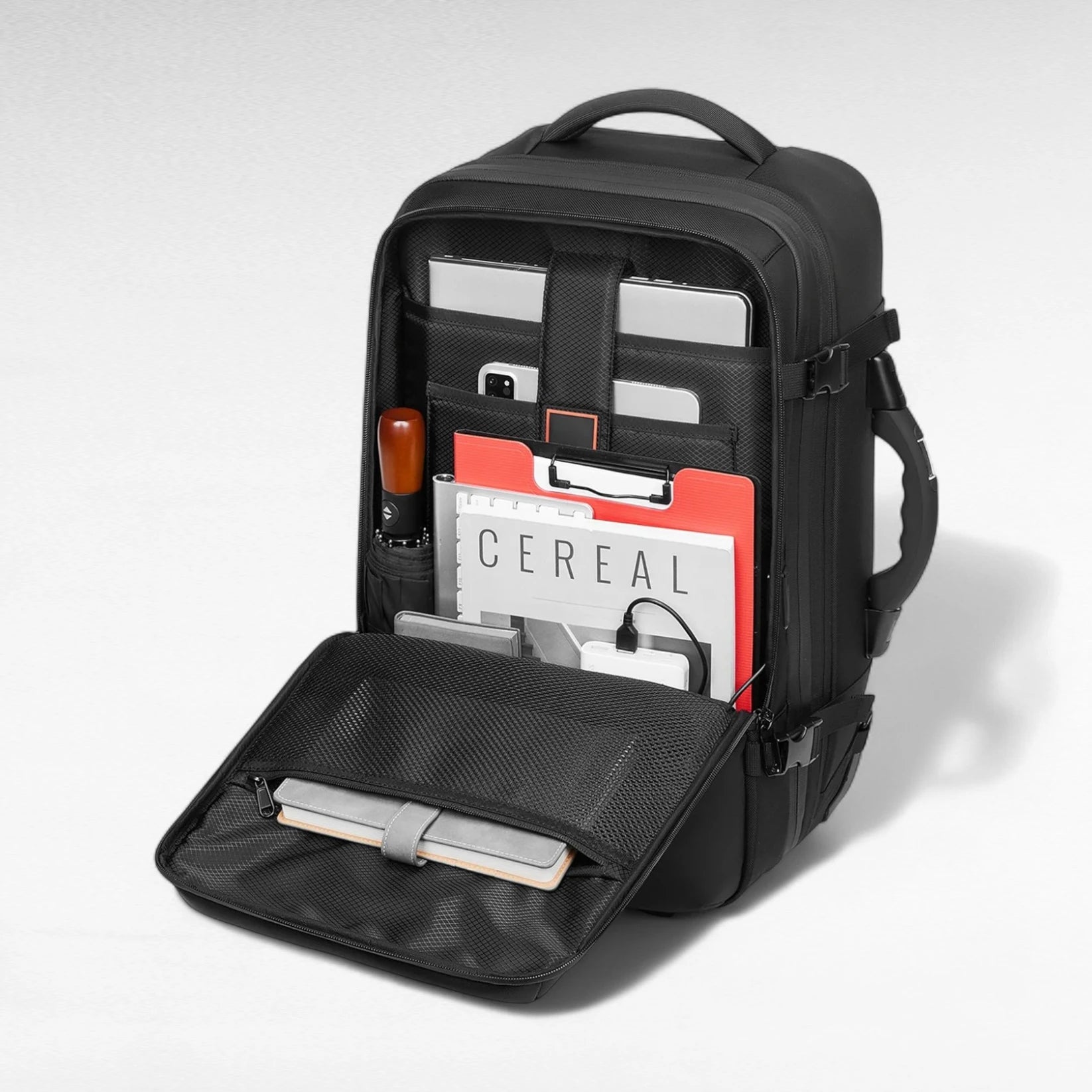The backpack is made of scratch-proof, water-resistant recycled TPU 1680D Oxford fabric and YKK zippers.