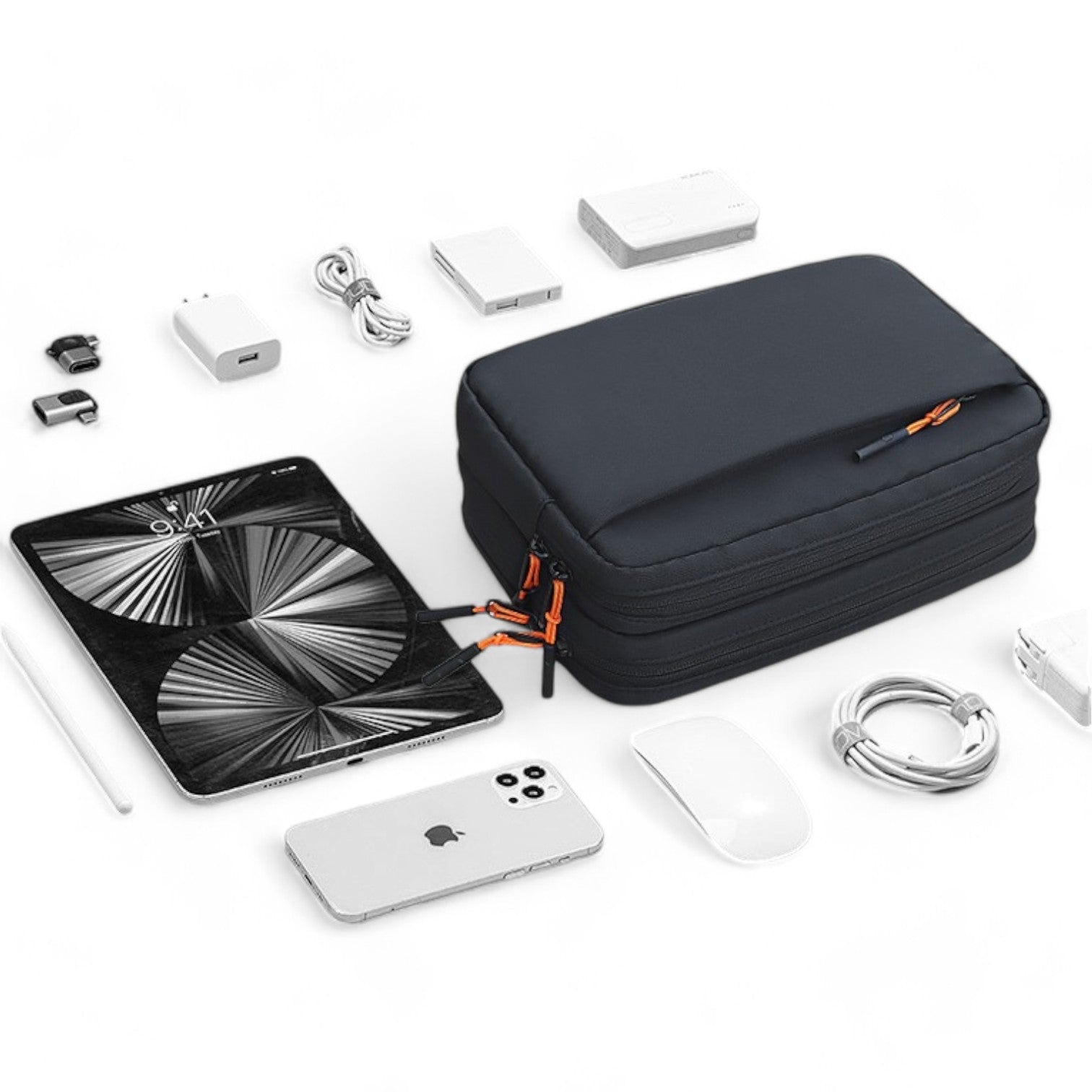 Crafted for streamlined travel, our double-layered tech organizer pouch holds your essentials without added bulk. Effortlessly organize with its high-visibility interior, protect your gear with waterproof features, and trust in its durable construction for lasting performance.